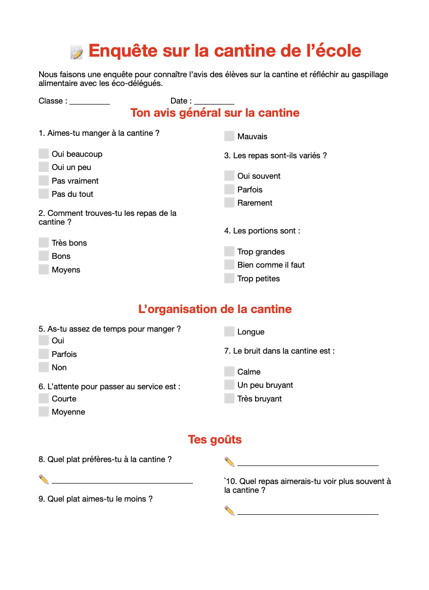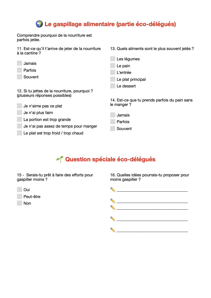 Les éco-délégués sont chargés de recueillir les avis et idées dans les classes. Le questionnaire suivant est proposé.